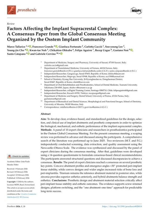 The consensus paper, titled “Factors affecting the implant supracrestal complex: A Consensus paper from the global consensus meeting organized by the Osstem Implant Community,” was published online on 18 February 2026 in Prosthesis. The full report is available on the Osstem Implant website.