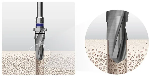 Excellent drilling power leads to skipping intermediate drilling which prevents bone heating by maintaining low drilling temperature.